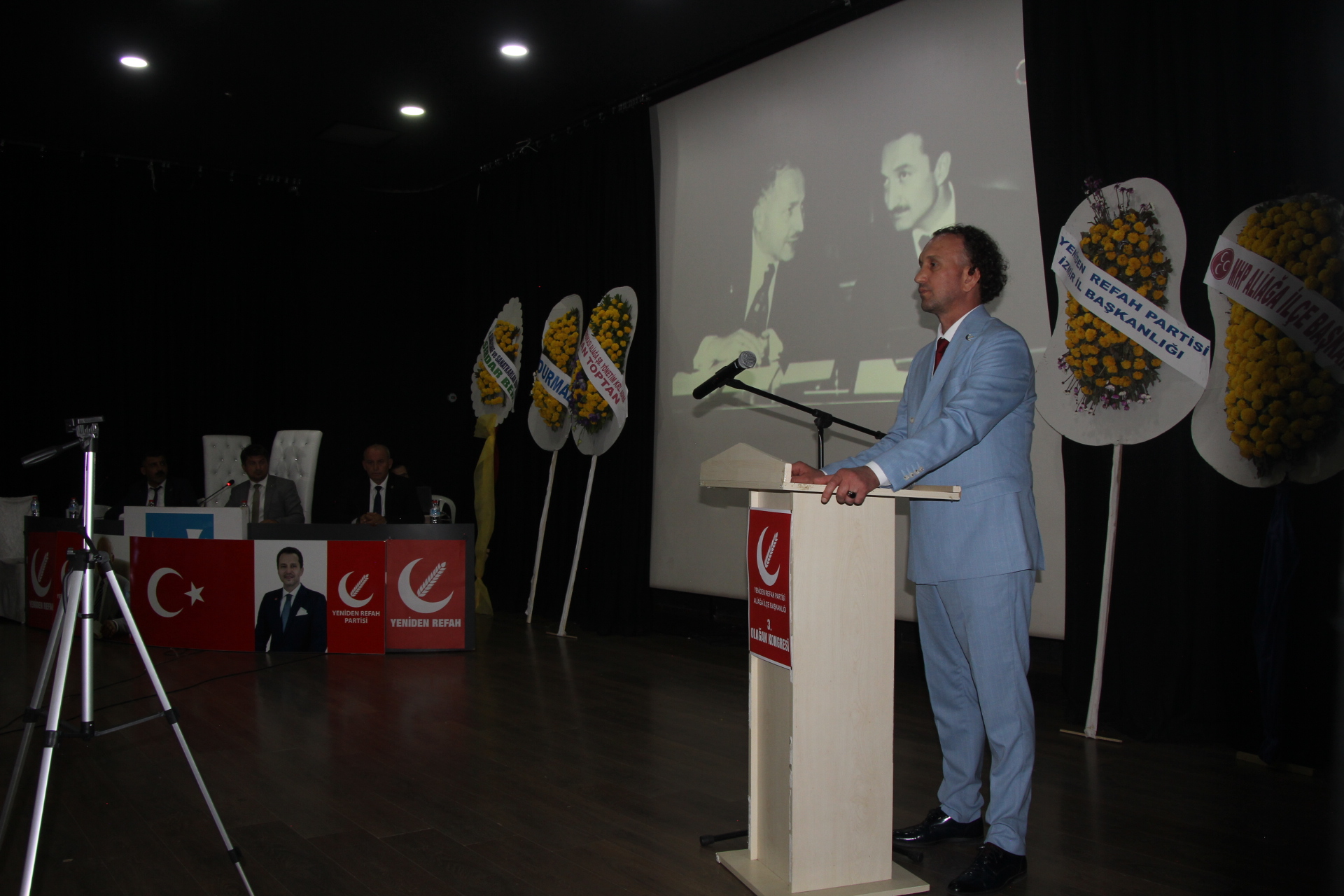 Programda ilk olarak kürsüye gelen Yeniden Refah Partisi İzmir İl Başkanı Cemal Arıkan,
