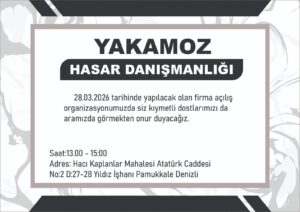” Sigorta hasar süreçleri birçok kişi için karmaşık ve yorucu bir süreç olabiliyor. Yakamoz Hasar Danışmanlığı’nı kurarken amacımız; Denizli’de sigortalı vatandaşlarımızın haklarını doğru şekilde alabilmesi için profesyonel destek sunmak oldu. Uzman kadromuzla birlikte hasar dosyalarının takibini titizlikle yaparak, vatandaşlarımızın mağduriyet yaşamadan süreçlerini tamamlamalarına yardımcı olmayı hedefliyoruz. 28 Mart 2026 tarihinde Pamukkale’de gerçekleştireceğimiz açılışımıza tüm dostlarımızı ve Denizli halkını bekliyoruz”